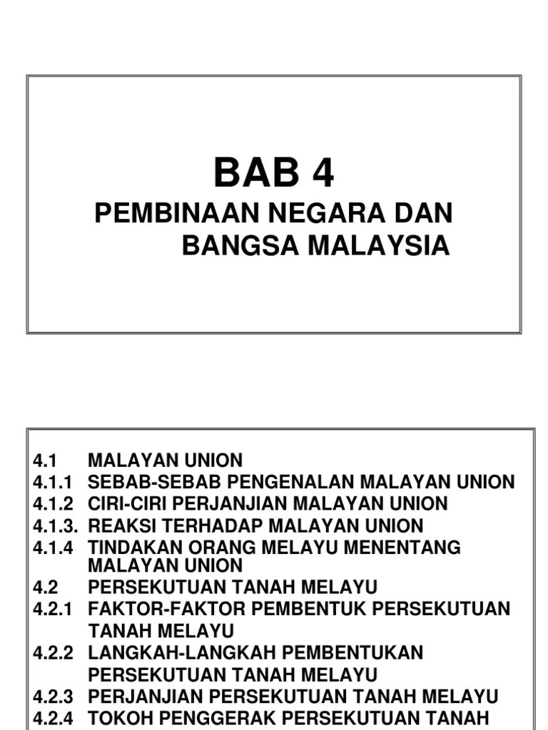 (2) sebab sebab malayan union dperkenalkan (15 markah) pengenalan malayan union pada tahun 1946 merupakan usaha british untuk menghapuskan negara dan bangsa yang telah dibina sejak zaman kesultanan melayu melaka. Ada 20 gudang lagu ting 4 bab 4 42 gagasan malayan union terbaru, klik salah satu untuk download lagu mudah dan cepat. British mahu menjimatkan perbelanjaan kos pentadbiran. Malayan union dibubarkan dan diganti dengan persekutuan tanah. Tingkatan 4 2020 bab 4 sebab dan cara menentang malayan union.