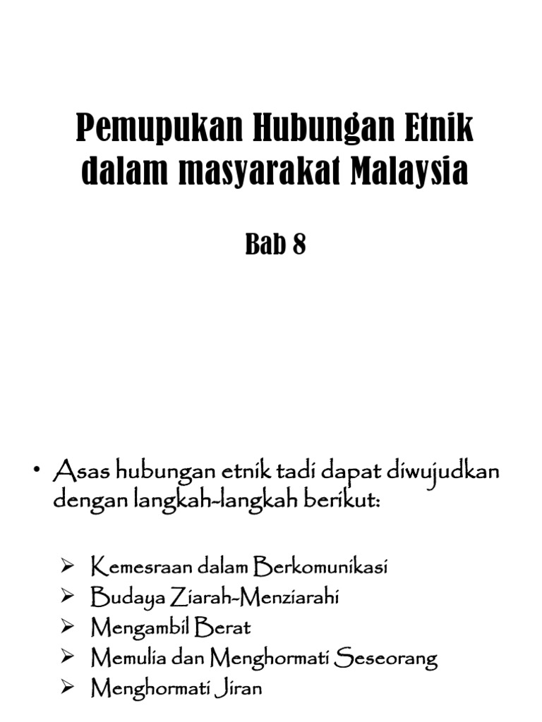 Hubungan Etnik Bab 8 - Berikut ini beberapa di antaranya: . Hasil pembelajaran memahami sejarah pembentukan masyarakat plural di malaysia. Bab 8islam &hubungan etnikctu553 hubungan etnikmahyuddinkhalid&ashrofzaki, uitm emkay@salam.uitm.edu.my. Bab 8 hubungan etnik islam & hubungan etnik. So please help us by uploading 1 new document or like us to download Konsep etnik merujuk kepada suatu kumpulan manusia yang dicirikan oleh.